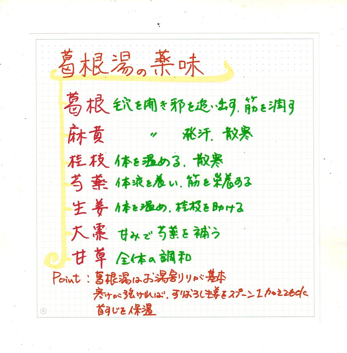 葛根湯には、気の通り道を温め、閉じている毛穴を緩めて寒さを外へ散らす働きや、筋肉を栄養し縮んで硬くなった筋を伸ばす薬味が含まれています。