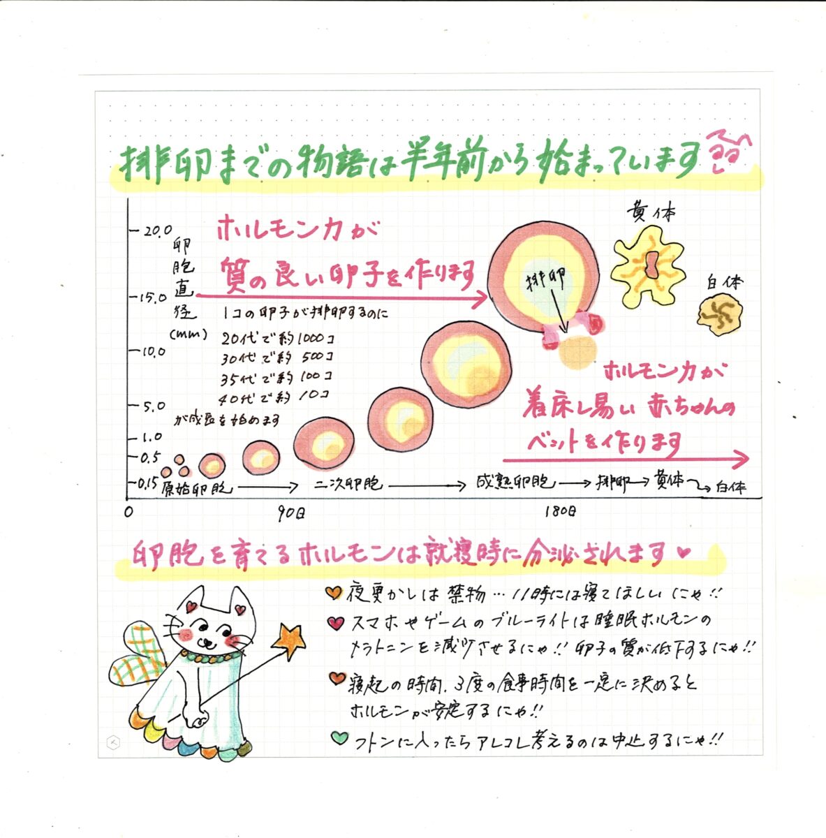 卵胞を育てるホルモンは夜寝ている間に分泌され、良い卵子は寝ている間に育って行きますので、夜更かしは禁物です。